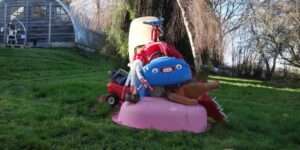 It is much harder to put large objects together, and the balancing act is epic when assessing what may go where and why! The arms alone involved the breakdown of an entire vacuum, all of which went back into the sculpture. The eleventh hour addition of the squashed paddling pool and slide really made it work for me, emulating those free plastic fast food models they used to give away with kids meals.
