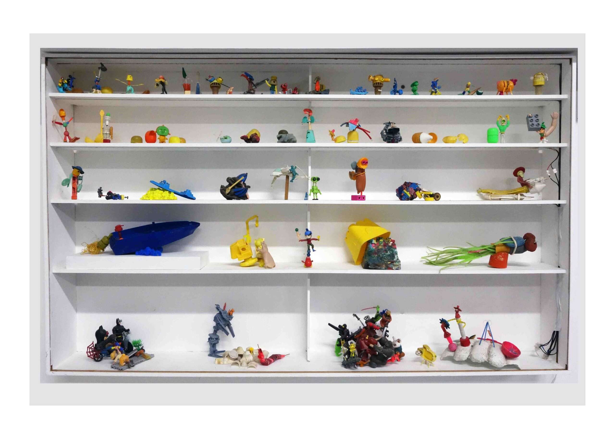 I finally found the solution to completing the now titled 'Poleaxed' work that has been several years in the making, and my largest work to date. There is still the detail of the flashing lights to complete, but essentially it is done and I am really happy with the feedback so far. This was a tricky one to do as I was essentially trying to imitate the way I have been creating my tiny 'kinder egg' works, those miniature models from tiny found objects, mutated Kinder model components and their eggs, such as the models on the top two rows of my cabinet.