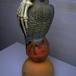 Eventually enough playing with components finds the right combination. There are only 4 parts to this piece, and many years separate them. The hand was donated several years ago, and almost completed many works as it is such a strong piece in its own right, but only after the hawk escaped years of garage storage did it find it's place. The floats make a stable perch; they came from The Chesil in Dorset last summer.