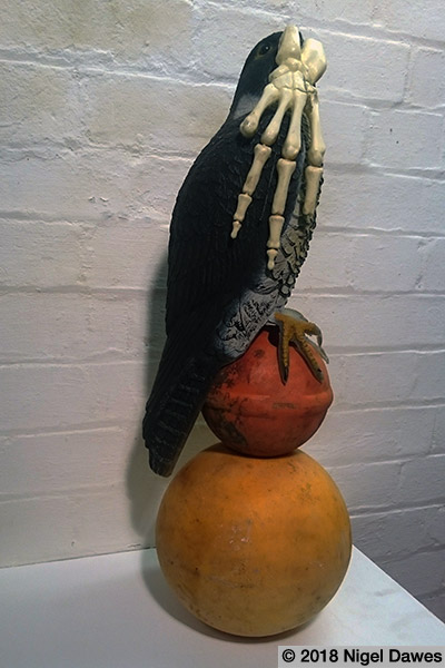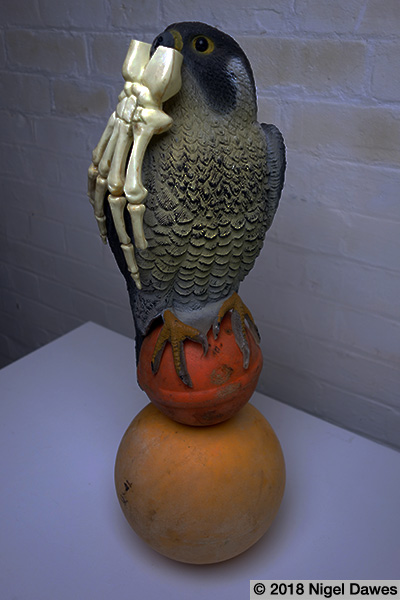 Eventually enough playing with components finds the right combination. There are only 4 parts to this piece, and many years separate them. The hand was donated several years ago, and almost completed many works as it is such a strong piece in its own right, but only after the hawk escaped years of garage storage did it find it's place. The floats make a stable perch; they came from The Chesil in Dorset last summer.