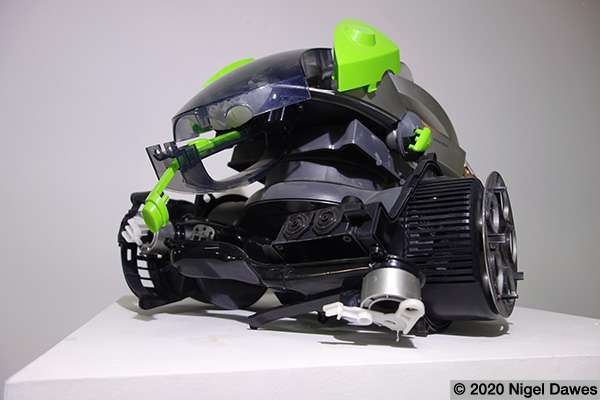 This sculpture, like many of my more successful mutations, didnt have much of a strategy or end game in mind when it was developing. I try to let the shapes take me with them as they reform into something new. There is a fine line taken between robotic machine and organic lifeform, and here I hopefully have kept both interpretations intact. I was thinking about the Borg from Star Trek, the way that the computer network attaches to the victim , forming a new symbiotic relationship where the host and invasive hardware become fused into  a new organism. Well, I didnt get too far along those lines, but there are still distant vacuum based elements visible within this mutated creature, and signs of sentient life within perhaps.