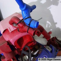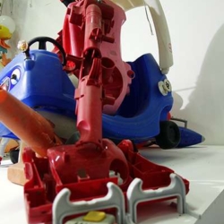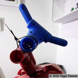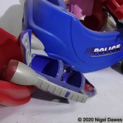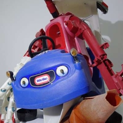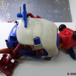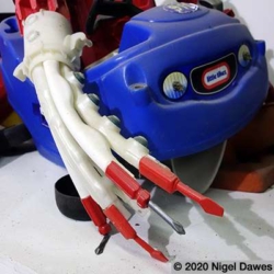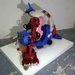 This sculpture is the latest development in an ongoing wrestle with various components, and the eventual abandoning of others such as a mannequin leg, various safety helmets, a playstation skateboard deck, and many other larger scale objects. The arms survive from other manifestations and forms, finally coming together in the stranger thing, an off world, heavily armed, mutated cop chase gone wrong. I am at an intersection between sci-fi, psychedelic distortion and Who Framed Roger Rabbit here, where Philip K Dick fights it out on the drawing board with Robert Crumb and Robert Zemeckis.