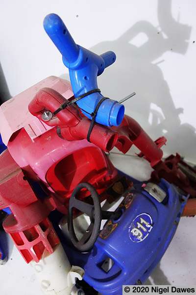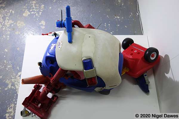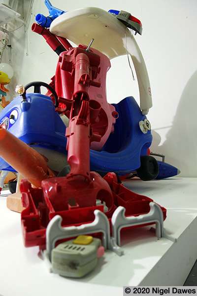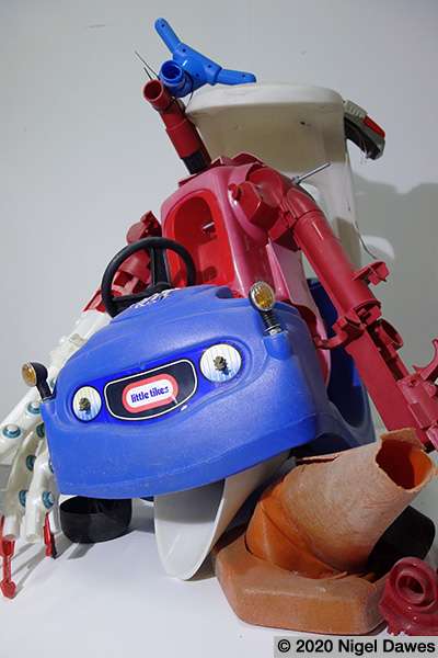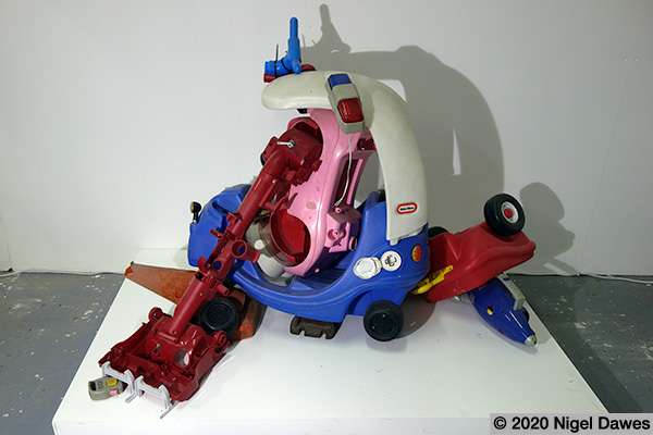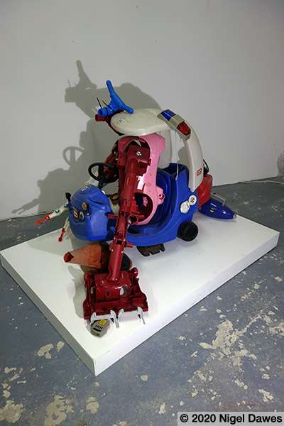 This sculpture is the latest development in an ongoing wrestle with various components, and the eventual abandoning of others such as a mannequin leg, various safety helmets, a playstation skateboard deck, and many other larger scale objects. The arms survive from other manifestations and forms, finally coming together in the stranger thing, an off world, heavily armed, mutated cop chase gone wrong. I am at an intersection between sci-fi, psychedelic distortion and Who Framed Roger Rabbit here, where Philip K Dick fights it out on the drawing board with Robert Crumb and Robert Zemeckis.