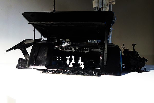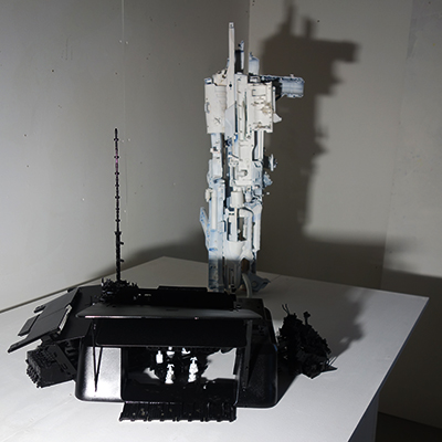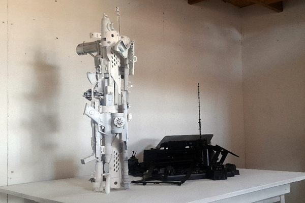 The third work a series concerned with developing an abstract narrative from the forms revealed from the dismantling of the objects selected. Another Canon Pixma inkjet printer has again revealed many objects for reassembling into a sculpture that occupies a space in between abstraction and narrative. Again the desire is to not commit to anything too literal, only to suggest drama. The tower structure is made entirely of a collection of water soakers.