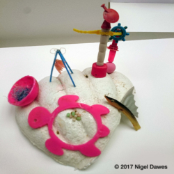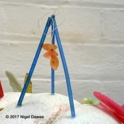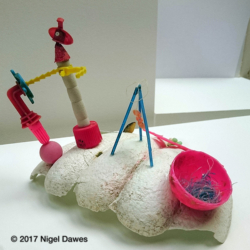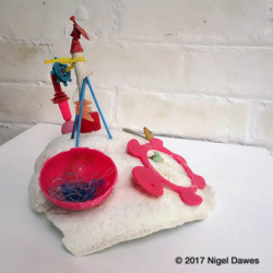 'Survive the Savage Sea' was constructed from the foraged plastic refuse from the coastline adjacent to the Newhaven Harbour Arm, directly below Newhaven Fort on a bright and sunny late autumn afternoon in Sussex. This is one of my most specific and direct representational pieces from the foraged series of works to date. I have manipulated various found objects by cutting and glueing together as I often do as I expand ideas.